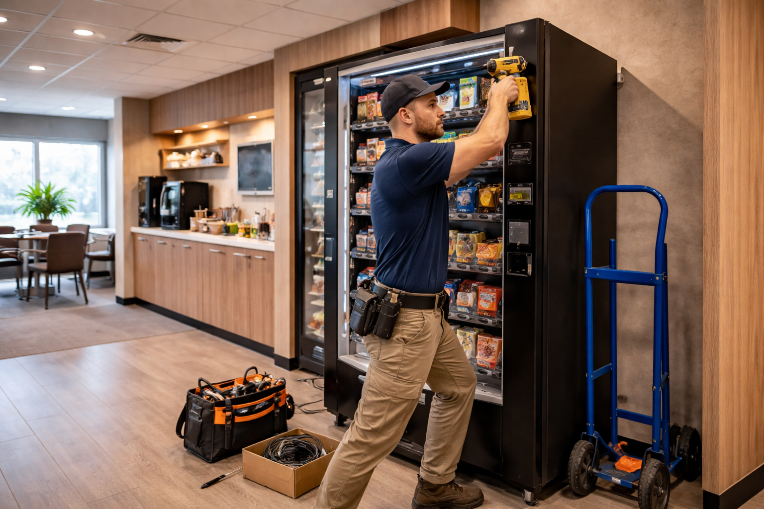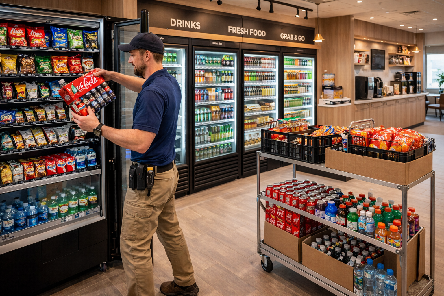 by offering easy access to snacks, beverages, and refreshments through clean, self-serve setups.